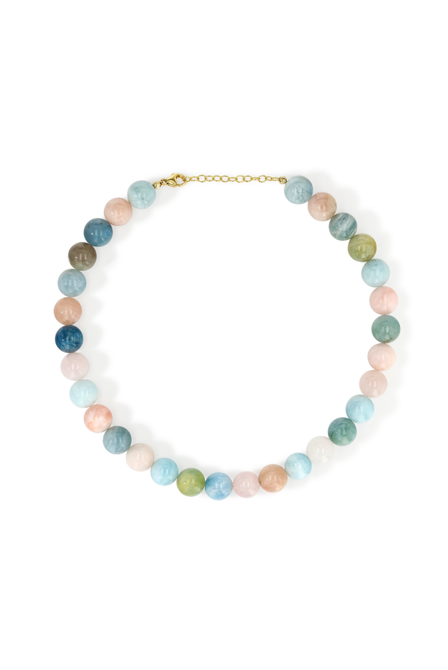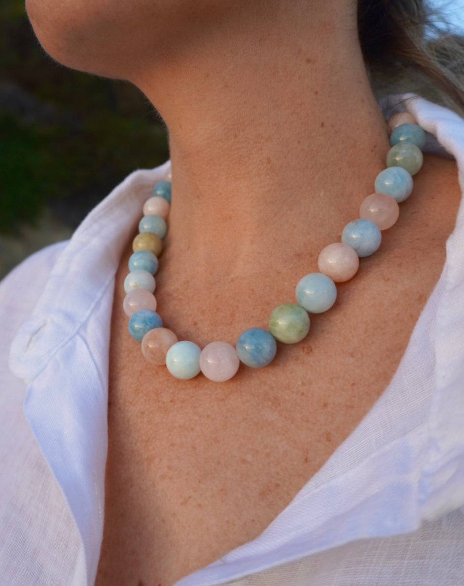 Vivid and rare, this necklace is crafted from 14mm Cotton Candy Malachite beads, each one patterned with unexpected swirls of pink, blue, green, and white. Celebrated as a stone of transformation, malachite is believed to protect, restore balance, and open the path to renewal. With its painterly colors, this piece captures a spirit of creativity and evolution — a striking reminder of beauty in change.