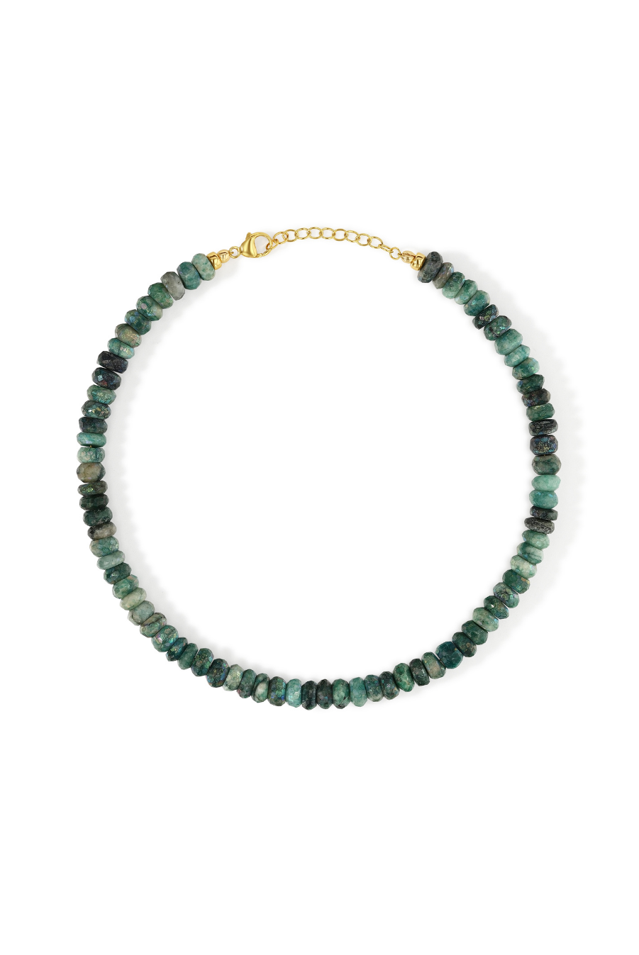 This necklace is strung with 8mm rondelle emerald beads, each glowing with the deep green hues of renewal and vitality. Emerald, long celebrated as a stone of harmony and protection, is believed to open the heart, inspire balance, and invite abundance. With its luminous color and grounding presence, this piece is a tribute to grace, strength, and new beginnings.