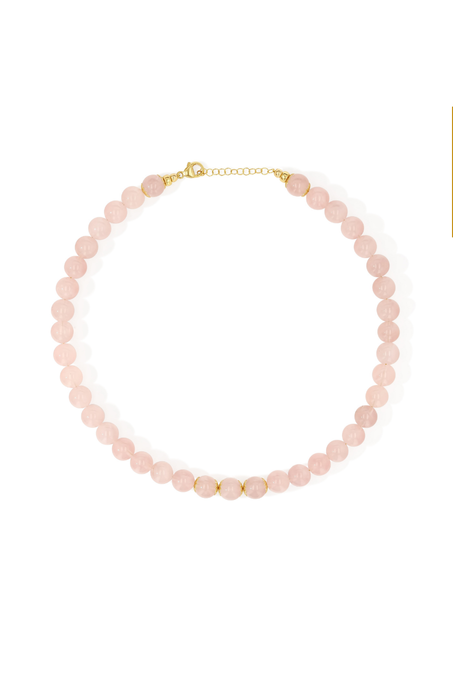 Soft and radiant, this necklace is strung with polished rose quartz beads — the stone of love, compassion, and emotional clarity. At its heart, three rose quartz beads are adorned with lotus covers, echoed again at the end caps, adding subtle detail and symbolic depth. The lotus, a timeless emblem of purity and renewal, pairs with rose quartz to create a piece that embodies openness and tenderness. Gentle yet powerful, this necklace is a reminder to lead with the heart and embrace new beginnings with grace.